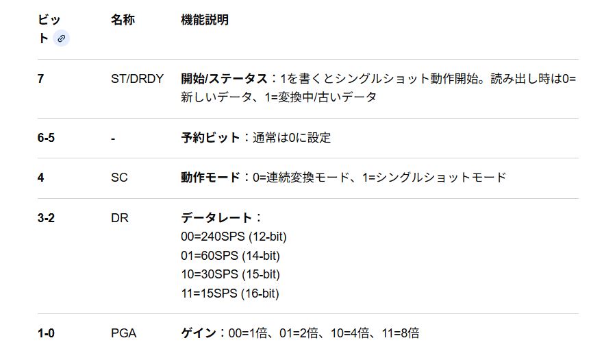 0x0C (0000 1100): 連続変換、15 SPS、ゲイン=1(開始信号なし)