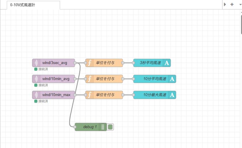 [{"id":"c31a01828a7d6717","type":"tab","label":"0-10V式風速計","disabled":false,"info":"","env":[]},{"id":"74c02f018504dd99","type":"mqtt in","z":"c31a01828a7d6717","name":"","topic":"wind/3sec_avg","qos":"2","datatype":"auto-detect","broker":"61e45e3515b67f80","nl":false,"rap":true,"rh":0,"inputs":0,"x":200,"y":200,"wires":[["0f0fe984d5cf198c","ad02db2e68f78bbb"]]},{"id":"32d1e716c05ef4f4","type":"ui-text","z":"c31a01828a7d6717","group":"a2862a7d5d758378","order":1,"width":0,"height":0,"name":"3秒平均風速","label":"3秒平均風速","format":"{{msg.payload}}","layout":"row-spread","style":true,"font":"Arial,Arial,Helvetica,sans-serif","fontSize":"24","color":"#fafafa","wrapText":false,"className":"","value":"payload","valueType":"msg","x":570,"y":200,"wires":[]},{"id":"0f0fe984d5cf198c","type":"debug","z":"c31a01828a7d6717","name":"debug 1","active":true,"tosidebar":true,"console":false,"tostatus":false,"complete":"false","statusVal":"","statusType":"auto","x":340,"y":440,"wires":[]},{"id":"ad02db2e68f78bbb","type":"function","z":"c31a01828a7d6717","name":"単位を付与","func":"var temp = msg.payload;\nvar data = temp + \" m/s\";\nmsg.payload = data;\nreturn msg;","outputs":1,"timeout":0,"noerr":0,"initialize":"","finalize":"","libs":[],"x":390,"y":200,"wires":[["32d1e716c05ef4f4"]]},{"id":"108dd3c33b249d41","type":"mqtt in","z":"c31a01828a7d6717","name":"","topic":"wind/10min_avg","qos":"2","datatype":"auto-detect","broker":"61e45e3515b67f80","nl":false,"rap":true,"rh":0,"inputs":0,"x":200,"y":260,"wires":[["71dc36c36bc92e3e"]]},{"id":"53fdf7bcb4a4cc0a","type":"mqtt in","z":"c31a01828a7d6717","name":"","topic":"wind/10min_max","qos":"2","datatype":"auto-detect","broker":"61e45e3515b67f80","nl":false,"rap":true,"rh":0,"inputs":0,"x":200,"y":320,"wires":[["762850e8d6bb2418"]]},{"id":"71dc36c36bc92e3e","type":"function","z":"c31a01828a7d6717","name":"単位を付与","func":"var temp = msg.payload;\nvar data = temp + \" m/s\";\nmsg.payload = data;\nreturn msg;","outputs":1,"timeout":0,"noerr":0,"initialize":"","finalize":"","libs":[],"x":390,"y":260,"wires":[["364e76a4d2331bce"]]},{"id":"762850e8d6bb2418","type":"function","z":"c31a01828a7d6717","name":"単位を付与","func":"var temp = msg.payload;\nvar data = temp + \" m/s\";\nmsg.payload = data;\nreturn msg;","outputs":1,"timeout":0,"noerr":0,"initialize":"","finalize":"","libs":[],"x":390,"y":320,"wires":[["75cc289fe5b1357b"]]},{"id":"364e76a4d2331bce","type":"ui-text","z":"c31a01828a7d6717","group":"a2862a7d5d758378","order":2,"width":0,"height":0,"name":"10分平均風速","label":"10分平均風速","format":"{{msg.payload}}","layout":"row-spread","style":true,"font":"Arial,Arial,Helvetica,sans-serif","fontSize":"24","color":"#fafafa","wrapText":false,"className":"","value":"payload","valueType":"msg","x":580,"y":260,"wires":[]},{"id":"75cc289fe5b1357b","type":"ui-text","z":"c31a01828a7d6717","group":"a2862a7d5d758378","order":3,"width":0,"height":0,"name":"10分最大風速","label":"10分最大風速","format":"{{msg.payload}}","layout":"row-spread","style":true,"font":"Arial,Arial,Helvetica,sans-serif","fontSize":"24","color":"#fafafa","wrapText":false,"className":"","value":"payload","valueType":"msg","x":580,"y":320,"wires":[]},{"id":"61e45e3515b67f80","type":"mqtt-broker","name":"","broker":"192.168.1.200","port":"1883","clientid":"","autoConnect":true,"usetls":false,"protocolVersion":4,"keepalive":60,"cleansession":true,"autoUnsubscribe":true,"birthTopic":"","birthQos":"0","birthRetain":"false","birthPayload":"","birthMsg":{},"closeTopic":"","closeQos":"0","closeRetain":"false","closePayload":"","closeMsg":{},"willTopic":"","willQos":"0","willRetain":"false","willPayload":"","willMsg":{},"userProps":"","sessionExpiry":""},{"id":"a2862a7d5d758378","type":"ui-group","name":"風速","page":"cef20d4917f1c9a7","width":6,"height":1,"order":1,"showTitle":false,"className":"","visible":"true","disabled":"false","groupType":"default"},{"id":"cef20d4917f1c9a7","type":"ui-page","name":"気象","ui":"debf650e7f1343d3","path":"/page1","icon":"home","layout":"grid","theme":"a45c7f2adf09be21","breakpoints":[{"name":"Default","px":"0","cols":"3"},{"name":"Tablet","px":"576","cols":"6"},{"name":"Small Desktop","px":"768","cols":"9"},{"name":"Desktop","px":"1024","cols":"12"}],"order":1,"className":"","visible":"true","disabled":"false"},{"id":"debf650e7f1343d3","type":"ui-base","name":"画面名","path":"/dashboard","appIcon":"","includeClientData":true,"acceptsClientConfig":["ui-notification","ui-control"],"showPathInSidebar":false,"headerContent":"page","navigationStyle":"default","titleBarStyle":"default","showReconnectNotification":true,"notificationDisplayTime":1,"showDisconnectNotification":true,"allowInstall":true},{"id":"a45c7f2adf09be21","type":"ui-theme","name":"気象","colors":{"surface":"#505050","primary":"#505050","bgPage":"#505050","groupBg":"#5f5f5f","groupOutline":"#cccccc"},"sizes":{"density":"default","pagePadding":"12px","groupGap":"12px","groupBorderRadius":"4px","widgetGap":"12px"}},{"id":"4a15a6018cc91f54","type":"global-config","env":[],"modules":{"@flowfuse/node-red-dashboard":"1.30.2"}}]