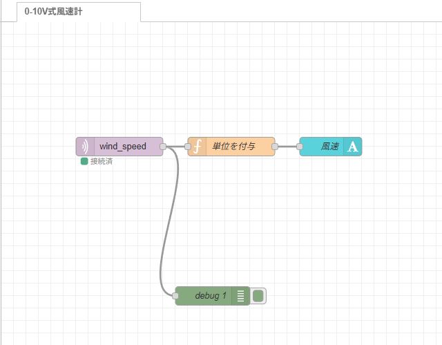 [{"id":"c31a01828a7d6717","type":"tab","label":"0-10V式風速計","disabled":false,"info":"","env":[]},{"id":"74c02f018504dd99","type":"mqtt in","z":"c31a01828a7d6717","name":"","topic":"wind_speed","qos":"2","datatype":"auto-detect","broker":"61e45e3515b67f80","nl":false,"rap":true,"rh":0,"inputs":0,"x":190,"y":200,"wires":[["0f0fe984d5cf198c","ad02db2e68f78bbb"]]},{"id":"32d1e716c05ef4f4","type":"ui-text","z":"c31a01828a7d6717","group":"a2862a7d5d758378","order":1,"width":0,"height":0,"name":"風速","label":"風速","format":"{{msg.payload}}","layout":"row-spread","style":true,"font":"Arial,Arial,Helvetica,sans-serif","fontSize":"24","color":"#fafafa","wrapText":false,"className":"","value":"payload","valueType":"msg","x":530,"y":200,"wires":[]},{"id":"0f0fe984d5cf198c","type":"debug","z":"c31a01828a7d6717","name":"debug 1","active":true,"tosidebar":true,"console":false,"tostatus":false,"complete":"false","statusVal":"","statusType":"auto","x":340,"y":440,"wires":[]},{"id":"ad02db2e68f78bbb","type":"function","z":"c31a01828a7d6717","name":"単位を付与","func":"var temp = msg.payload;\nvar data = temp + \" m/s\";\nmsg.payload = data;\nreturn msg;","outputs":1,"timeout":0,"noerr":0,"initialize":"","finalize":"","libs":[],"x":370,"y":200,"wires":[["32d1e716c05ef4f4"]]},{"id":"61e45e3515b67f80","type":"mqtt-broker","name":"","broker":"192.168.1.200","port":"1883","clientid":"","autoConnect":true,"usetls":false,"protocolVersion":4,"keepalive":60,"cleansession":true,"autoUnsubscribe":true,"birthTopic":"","birthQos":"0","birthRetain":"false","birthPayload":"","birthMsg":{},"closeTopic":"","closeQos":"0","closeRetain":"false","closePayload":"","closeMsg":{},"willTopic":"","willQos":"0","willRetain":"false","willPayload":"","willMsg":{},"userProps":"","sessionExpiry":""},{"id":"a2862a7d5d758378","type":"ui-group","name":"風速","page":"cef20d4917f1c9a7","width":6,"height":1,"order":1,"showTitle":false,"className":"","visible":"true","disabled":"false","groupType":"default"},{"id":"cef20d4917f1c9a7","type":"ui-page","name":"気象","ui":"debf650e7f1343d3","path":"/page1","icon":"home","layout":"grid","theme":"a45c7f2adf09be21","breakpoints":[{"name":"Default","px":"0","cols":"3"},{"name":"Tablet","px":"576","cols":"6"},{"name":"Small Desktop","px":"768","cols":"9"},{"name":"Desktop","px":"1024","cols":"12"}],"order":1,"className":"","visible":"true","disabled":"false"},{"id":"debf650e7f1343d3","type":"ui-base","name":"画面名","path":"/dashboard","appIcon":"","includeClientData":true,"acceptsClientConfig":["ui-notification","ui-control"],"showPathInSidebar":false,"headerContent":"page","navigationStyle":"default","titleBarStyle":"default","showReconnectNotification":true,"notificationDisplayTime":1,"showDisconnectNotification":true,"allowInstall":true},{"id":"a45c7f2adf09be21","type":"ui-theme","name":"気象","colors":{"surface":"#505050","primary":"#505050","bgPage":"#505050","groupBg":"#5f5f5f","groupOutline":"#cccccc"},"sizes":{"density":"default","pagePadding":"12px","groupGap":"12px","groupBorderRadius":"4px","widgetGap":"12px"}},{"id":"68ee9dee6ee5f000","type":"global-config","env":[],"modules":{"@flowfuse/node-red-dashboard":"1.30.2"}}]
