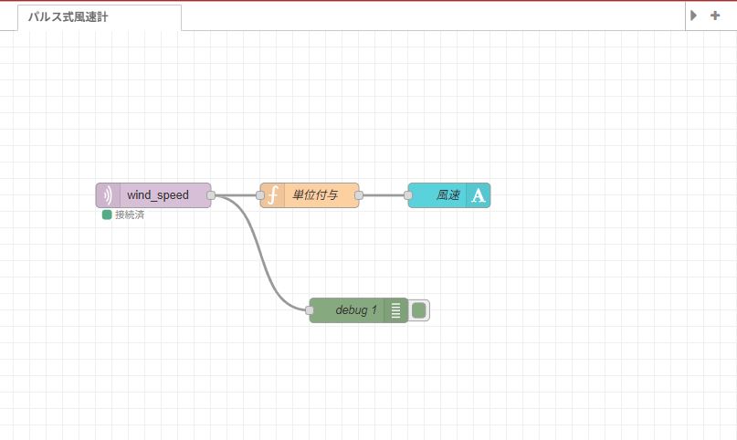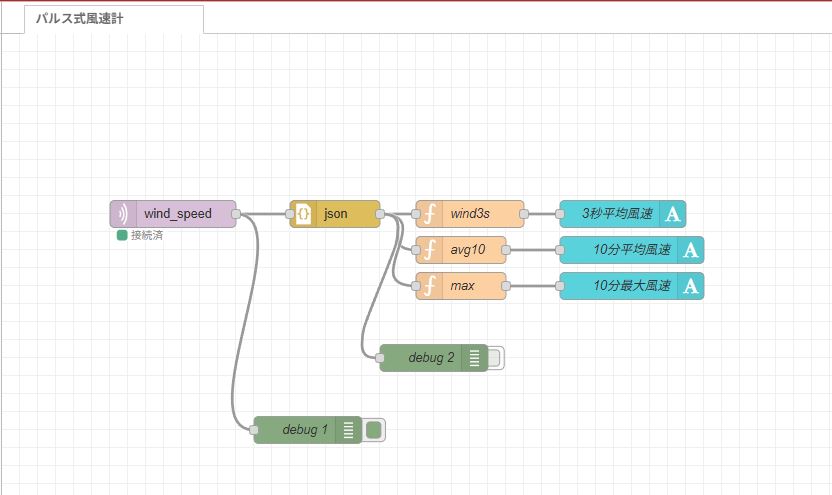 [{"id":"c31a01828a7d6717","type":"tab","label":"パルス式風速計","disabled":false,"info":"","env":[]},{"id":"74c02f018504dd99","type":"mqtt in","z":"c31a01828a7d6717","name":"","topic":"wind_speed","qos":"2","datatype":"auto-detect","broker":"61e45e3515b67f80","nl":false,"rap":true,"rh":0,"inputs":0,"x":190,"y":200,"wires":[["ac1a366d1ac2439e","0f0fe984d5cf198c"]]},{"id":"ac1a366d1ac2439e","type":"json","z":"c31a01828a7d6717","name":"","property":"payload","action":"obj","pretty":false,"x":370,"y":200,"wires":[["66da9ef6123e54c9","2f641fe696a56153","0dbc4eba2af4d55b","5f9e09662e85ddd7"]]},{"id":"66da9ef6123e54c9","type":"function","z":"c31a01828a7d6717","name":"wind3s","func":"var temp = msg.payload.inst;\nmsg.payload = temp + \" m/s\";\nreturn msg;\n\n","outputs":1,"timeout":0,"noerr":0,"initialize":"","finalize":"","libs":[],"x":520,"y":200,"wires":[["32d1e716c05ef4f4"]]},{"id":"2f641fe696a56153","type":"function","z":"c31a01828a7d6717","name":"avg10","func":"var temp = msg.payload.avg10;\nmsg.payload = temp + \" m/s\";\nreturn msg;","outputs":1,"timeout":0,"noerr":0,"initialize":"","finalize":"","libs":[],"x":510,"y":240,"wires":[["e1861955adadd532"]]},{"id":"0dbc4eba2af4d55b","type":"function","z":"c31a01828a7d6717","name":"max","func":"var temp = msg.payload.max;\nmsg.payload = temp + \" m/s\";\nreturn msg;\n","outputs":1,"timeout":0,"noerr":0,"initialize":"","finalize":"","libs":[],"x":510,"y":280,"wires":[["abefaff50b0c8deb"]]},{"id":"32d1e716c05ef4f4","type":"ui-text","z":"c31a01828a7d6717","group":"a2862a7d5d758378","order":1,"width":0,"height":0,"name":"3秒平均風速","label":"3秒平均風速","format":"{{msg.payload}}","layout":"row-center","style":true,"font":"Arial,Arial,Helvetica,sans-serif","fontSize":"24","color":"#fafafa","wrapText":false,"className":"","value":"payload","valueType":"msg","x":690,"y":200,"wires":[]},{"id":"e1861955adadd532","type":"ui-text","z":"c31a01828a7d6717","group":"a2862a7d5d758378","order":2,"width":0,"height":0,"name":"10分平均風速","label":"10分平均風速","format":"{{msg.payload}}","layout":"row-center","style":true,"font":"Arial,Arial,Helvetica,sans-serif","fontSize":"24","color":"#fafafa","wrapText":false,"className":"","value":"payload","valueType":"msg","x":700,"y":240,"wires":[]},{"id":"abefaff50b0c8deb","type":"ui-text","z":"c31a01828a7d6717","group":"a2862a7d5d758378","order":3,"width":0,"height":0,"name":"10分最大風速","label":"10分最大風速","format":"{{msg.payload}}","layout":"row-center","style":true,"font":"Arial,Arial,Helvetica,sans-serif","fontSize":"24","color":"#fafafa","wrapText":false,"className":"","value":"payload","valueType":"msg","x":700,"y":280,"wires":[]},{"id":"0f0fe984d5cf198c","type":"debug","z":"c31a01828a7d6717","name":"debug 1","active":true,"tosidebar":true,"console":false,"tostatus":false,"complete":"false","statusVal":"","statusType":"auto","x":340,"y":440,"wires":[]},{"id":"5f9e09662e85ddd7","type":"debug","z":"c31a01828a7d6717","name":"debug 2","active":false,"tosidebar":true,"console":false,"tostatus":false,"complete":"false","statusVal":"","statusType":"auto","x":480,"y":360,"wires":[]},{"id":"61e45e3515b67f80","type":"mqtt-broker","name":"","broker":"192.168.1.200","port":"1883","clientid":"","autoConnect":true,"usetls":false,"protocolVersion":4,"keepalive":60,"cleansession":true,"autoUnsubscribe":true,"birthTopic":"","birthQos":"0","birthRetain":"false","birthPayload":"","birthMsg":{},"closeTopic":"","closeQos":"0","closeRetain":"false","closePayload":"","closeMsg":{},"willTopic":"","willQos":"0","willRetain":"false","willPayload":"","willMsg":{},"userProps":"","sessionExpiry":""},{"id":"a2862a7d5d758378","type":"ui-group","name":"風速","page":"cef20d4917f1c9a7","width":6,"height":1,"order":1,"showTitle":false,"className":"","visible":"true","disabled":"false","groupType":"default"},{"id":"cef20d4917f1c9a7","type":"ui-page","name":"気象","ui":"debf650e7f1343d3","path":"/page1","icon":"home","layout":"grid","theme":"a45c7f2adf09be21","breakpoints":[{"name":"Default","px":"0","cols":"3"},{"name":"Tablet","px":"576","cols":"6"},{"name":"Small Desktop","px":"768","cols":"9"},{"name":"Desktop","px":"1024","cols":"12"}],"order":1,"className":"","visible":"true","disabled":"false"},{"id":"debf650e7f1343d3","type":"ui-base","name":"画面名","path":"/dashboard","appIcon":"","includeClientData":true,"acceptsClientConfig":["ui-notification","ui-control"],"showPathInSidebar":false,"headerContent":"page","navigationStyle":"default","titleBarStyle":"default","showReconnectNotification":true,"notificationDisplayTime":1,"showDisconnectNotification":true,"allowInstall":true},{"id":"a45c7f2adf09be21","type":"ui-theme","name":"気象","colors":{"surface":"#505050","primary":"#505050","bgPage":"#505050","groupBg":"#5f5f5f","groupOutline":"#cccccc"},"sizes":{"density":"default","pagePadding":"12px","groupGap":"12px","groupBorderRadius":"4px","widgetGap":"12px"}},{"id":"c46003c3f93ed961","type":"global-config","env":[],"modules":{"@flowfuse/node-red-dashboard":"1.30.2"}}]