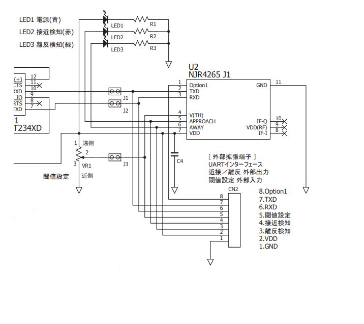 まずドップラーセンサーのジャンパーJ1とJ2を外して外部端子RX TXからRS232Cを使えるように変